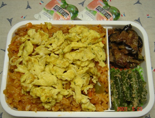 5月23日のお弁当あやっち(長女:高1)のお弁当です。ほぼ同じものを、私も食べています。・こんにゃくゼリー・白桃味・ケチャップライス 合びきミンチ+玉ねぎ+人参+ピーマン・炒り卵 生クリーム+ドライパセリ・なすの塩もみ 鰹節和え・いんげんの胡麻和え今日のお弁当は、大好評でした。いつも残さず、きれいに食べてくるのですが、【洋風】なお弁当が、うれしかったようです。