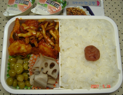 5月24日のお弁当あやっち(長女:高1)のお弁当です。ほぼ同じものを、私も食べています。・こんにゃくゼリー・白桃味・ふりかけ・かつお味・鶏肉としめじの中華風ケチャップ炒め・うぐいす豆の甘煮(市販品)・レンコンの煮物・白米+梅干し