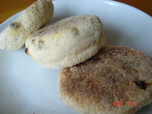 カレンツ入りイングリッシュマフィンいろいろ家事がたまっていて、今日は、ずっと家に居る予定だったので、カレンツ入りイングリッシュマフィンを焼いてみました。12個あったけれども、撮影する前に、3個になりました。2次発酵後、ホットプレート180度で焼くのですが、どうみても、焼きすぎ。先日、新しいホットプレートに変えたのですが、これは、以前使用していたものより、火力が強いようです。次回は気をつけよう。焼きすぎだけど、味は良くて、娘たちにも好評でした。