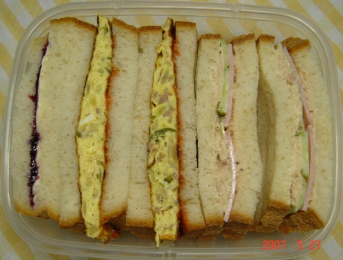 5月27日のお弁当あやっち(長女:高1)のお弁当です。今日は高校の部活動のため、お弁当持ちで、出かけて行きました。・クリームチーズとブルーベリージャムのサンドイッチ・オムレツのサンドイッチ 合びきミンチと玉ねぎとピーマン入りオムレツ サンドイッチの具がマンネリなので、これを作ってみました。・ロースハムときゅうりとツナマヨのサンドイッチ5月28日から6月1日まで、高校の前期中間テストです。(2学期制です)毎日2時間ずつテストをするそうです。お弁当は、その間、お休みします。