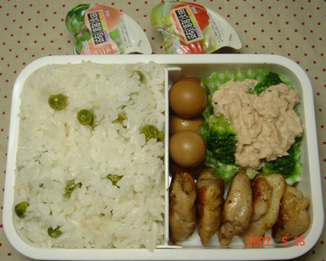 5月25日のお弁当あやっち(長女:高1)のお弁当です。ほぼ同じものを、私も食べています。・こんにゃくゼリー・白桃味とりんご味・グリーンピースの豆ごはん・うずらの卵のさっぱり煮 酢+しょうゆ+砂糖 で煮てあります。 前日夕食のメニューが、鶏肉と卵のさっぱり煮だったので、 お弁当用のうずらの卵も、一緒に煮ておきました。・ブロッコリーのツナマヨかけ・鶏もも肉のソテー・クレイジーソルト味今日のお弁当は、お友達に、「質素だね。」と言われたそうです。「お友達は、どんなお弁当なの?」と聞いたら、「冷凍食品全開で、おかずの品数が多い。」そっかぁ。。。でも、当分はこんな感じのお弁当を作る予定です。
