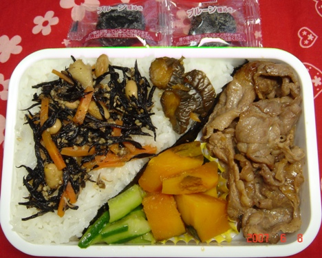 6月8日のお弁当あやっち(長女:高1)のお弁当です。ほぼ同じものを、私も食べています。 【おやつ用】 友人と、学校の購買でパンを買って食べる約束をしたから、 いらない、とのことで、おやつ用おにぎりは無しです。【昼食用】 ・プルーン ・白米+きゅうりのキューちゃん+ひじきの煮物 ・豚の生姜焼き ・かぼちゃの甘煮 ・きゅうりの中華あえ