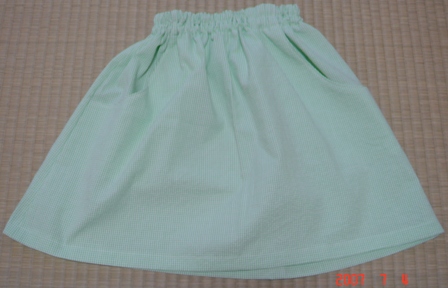 ギンガム黄緑のスカート ギンガム紺のスカートサッカー生地・細かいギンガムチェック柄で、まなっち(次女:小2)のスカートを作りました。サイズは120センチ、同じ形のスカートです。小学校に行く時は、ハンカチとティッシュをポケットに入れて行くので、ポケットも付けてあります。