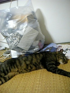 疲れた今日はもう(mー_ー)m.。o○ zZZZ昨日ごはんを食べておなかいっぱいでぐったり``r(^^;)ポリポリおじさんの部屋で就寝(__).。oOグゥー可愛い顔で寝てるのに後ろのごみが 気になる : ゙;(;゚;ω;゚; )キュ-