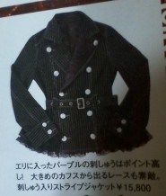 アルゴンキンの「刺繍入りストライプジャケット」がとっても可愛いのに楽天のお店に載ってないKERA最新号の広告(P032-033)に載ってるんだけど…。写真で見ると刺繍が解りにくいんだけど、実物は一目で刺繍に目が行くぐらいパープルがハッキリ出てて素敵でした。訳あって立ち止まって見る事ができないので、どんな刺繍なのかは解らぬままです…。アルゴンキン ALGONQUINS OFFICIAL