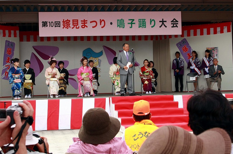 毎年5月3日に行われる 今年は10回目遠い昔からあった祭りだが戦争のごたごたで一度絶えた 近年また復活させたこのお嫁さんの中に江南市の職員が2名いるとか 来賓の堀江南市長も張り切っていました