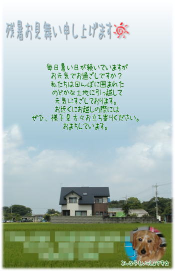 先日、やっと「引っ越しました」のハガキをポストに投函しまして、昨日早速、「ハガキがきたよー」という連絡が舞い込んできております(^.^)同時に転居先不明な方もボチボチ・・・たまたま、喪中で年賀状を一回パスしていたので、連絡先が分からなくなる方がいるんですね(^_^;)そんなわけで、先日お約束いたしました通り、ハガキのデザインを公開いたします(^.^)公開するほど、大したデザインではございませんが(^_^;)えへへ(^_^;)追記・・・しまった。。。みなさん、この田園風景に呑まれてしまいましたか(^_^;)も、ちっとわかりやすく手を加えておくんだったかな(^_^;)一応、ハガキのデザインです、コレ(^_^;)今年の敬老の日は9月19日。毎年遅れがちなので、今年は間に合うように贈りたいですね(^_^;)「ネットショッピングの達人のお買い物歴」ネットショッピング経験の豊富な皆さんが、ご自分のお買物を紹介しています(^.^)品物について質問すれば、使った感想も聞けますよ♪商品数は少ないながら、あずきも参加させていただいてます(^.^)あなたも参加しませんか?(^.^)TOP INDEX