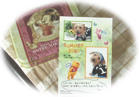 8日の日に、あきさんとアロエちゃんから、贈り物が届きました(*^_^*)クイズに正解した商品だったんです(^.^)というわけで、お見せいたします♪ディズニーのホテル、ミラコスタ限定のチョコレート(^.^)アロエちゃんが可愛い暑中見舞いのカード(^.^)折角だから、可愛いアロエちゃんをご堪能ください(^.^)そして、今回のメインはコレ!ポストカードの裏面に押してもらった、肉球スタンプ(まめ印)!!うちのハリーさんもまめ印押して、並べてみました(^.^)写真にしたら、あまり違って見えないのですが、一回りほどはハリーの方が足が大きいです。この加工をした後、ハリーさんが7キロを越えたことが分かりました(^_^;)あきさん&アロエちゃん変なリクエストにお答えいただきまして、ありがとうございました_(_^_)_ ハリーは大人しくお洋服を着てくれそうもないので、それだけでもうらやましいのですが、女の子わんこちゃんは、可愛い服が着せられていいなぁーと思います(>w