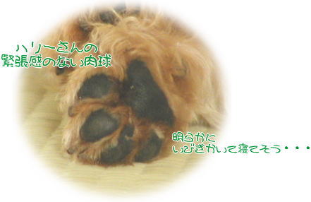 ・玄米ごはん・夏野菜カレー (豚赤身ひき肉・たまねぎ・セロリ・茄子・かぼちゃ・オクラ・にんじん)・サーモンサラダ (鮭の刺身・レタス・キュウリ・大根・たまねぎ・パプリカ+マヨ&ポン酢)・豆腐とニラの味噌汁・カスピ海ヨーグルト+冷凍ピーチ夏野菜のカレーにはひき肉が合いますねー。たまねぎとセロリは、粗みじんで先に炒めてるのでルーの一部ですが、他の野菜は結構ゴロゴロ残ってるので、お肉が塊で入って無くても満足出来ます(^.^)うーん。でも、じゃがいもも入れて、もっと嵩を増やしておいた方が良かったかな。夕食+朝食分くらいしか出来上がらなかった(^_^;)も少しあったら、お昼にカレーうどんとかカレーパスタとか出来たなぁ(笑)平和な顔して寝ておる・・・(ーー♯)早起き散歩のおかげで、ハリーさんは元気です。その分、元気が余っていて「いばってます」(T_T)夜になっても体力余ってますから、いつまでたっても「遊べ~」と吠えます(T_T)私も叱ります。叩きます。怒鳴ってしまいます。かなり本気で叩かないと、大人しくなってくれない・・・。そんなこんな(他にも理由はあるけども)で、私が布団に寝たのは2時半。その後、ハリー征伐に起きること4回。それでも5時半に起きる私(T_T)(これ書いてるのは5日の朝です。。。)3時間寝れなかった・・・。Miya君も起きはしないものの、寝ながらもうるさいと感じていたのでしょう。夢の中で「うるさい何か」を追い払うつもりだったのかなぁ。。。5時半に起き上がろうとした私の後ろ頭に、Miya君の腕がHIT!(T_T)何故、朝っぱらから。。。(T_T)こうして、飼い主に迷惑かけまくりのハリーは、昼間一人で安眠をむさぼるんです(ーー;)今(5日、午前9時)も、ダイニングテーブルの下でスカスカ寝てやがります(ーー;)このこの!起きてろ!!(足先でつついている)とりあえず、無駄と思いつつハリーの安眠を妨害してみる私でした。。。むっきーーーーーっっ!!(>ロw