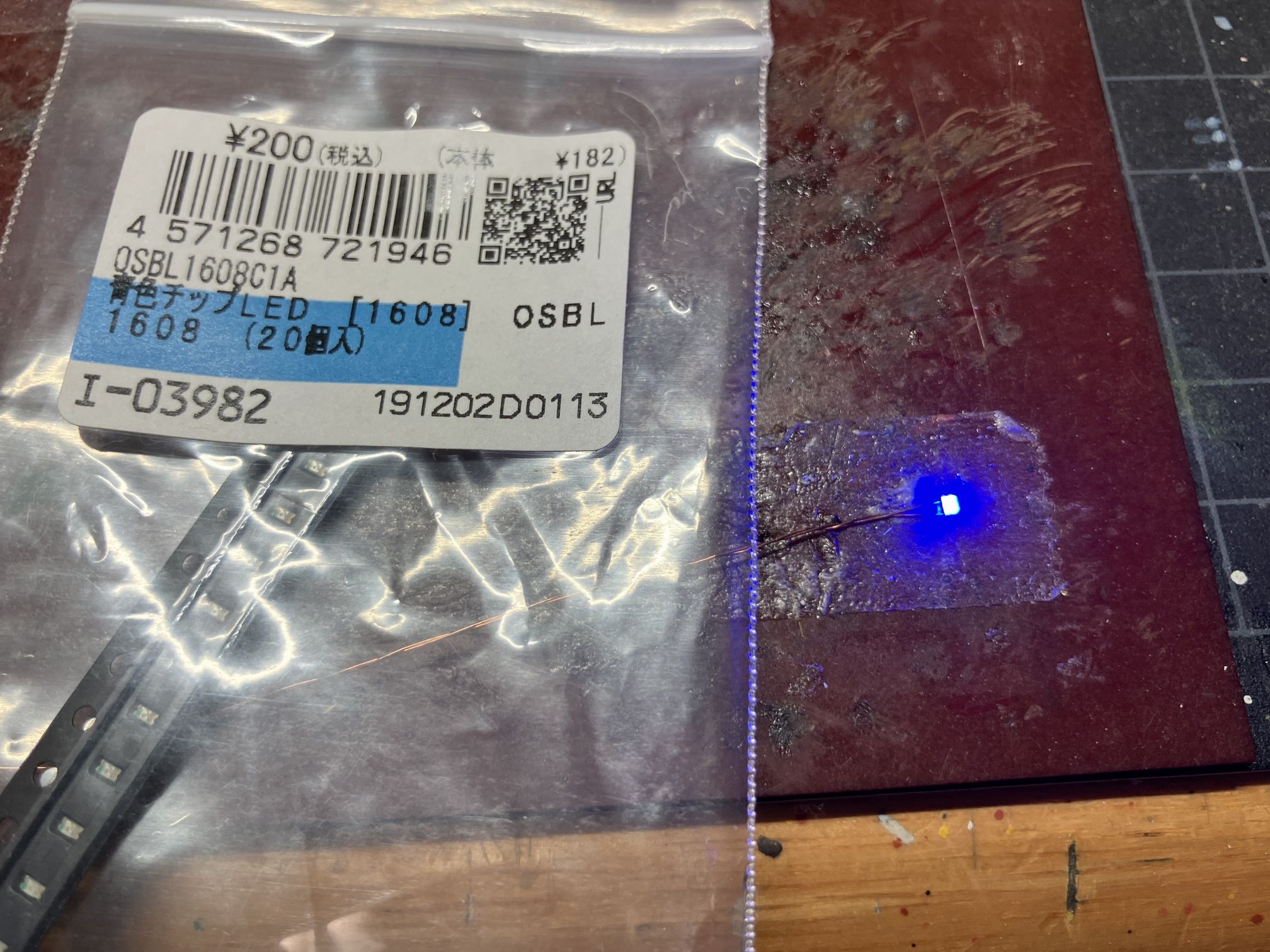 1.6x0.8mmのチップLEDにリード線をハンダつけ。これを6個も繰り返すと、ムスカ大佐に…(元ネタは天空の城ラピュタ)主翼上面の該当箇所に穴を空けて、LEDを埋め込みます。じつは、ここを光らせるのは初めて。こんなことをしているから、ちっとも進まない。でも、ここまで出来たら、あとは組み立てるだけ。
