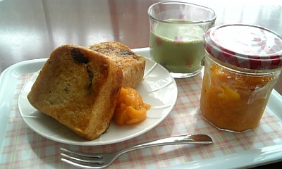 全粒粉いりのレーズンパン(キューブ型)を半分に切ってフレンチトーストにして枇杷ジャムを添えました♪