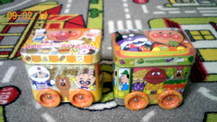 缶が3種類(パン屋さん・八百屋さん・お花屋さん柄)あって連結出来るんだけど各500円だし…3歳児だし…男の子なので…お花屋さんのは買わず(^^ゞ