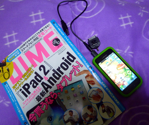 DIMEの付録で スマートフォン対応携帯充電コードがついていたので 買っちゃいました・・・ギャラクシーSにはちゃんと対応していますよ i-phoneにも対応しています・・・ 最近散在しすぎって思うけれど これは必要経費だし欲しいと思っていたので買ったよ・・・どちらかというと タブレットや最新のアンドロイドより 私はワイヤレスのセカンドテレビの特集ページでビエラが欲しいと思いました・・・世の中何がなんだかわからない・・・通信も家電も一緒になってしまっている感じですね・・・ついていけません 私は・・・未だにスマートフォン使いこなしているとは絶対に言い難い・・・フリック打ちマスターしないとスマートフォン持ってる意味ないなと思うのですが・・・未だにケータイ打ちしてます ははは・・・ さて こちらの 付録 充電機能ちゃんとはたらいてて いい感じです ふつうに充電するよりゆるやかに多少時間がかかるけれど スマホ以外にi-mode端末も充電したいので 同時に充電できるから これからがんがん役立ちそうです