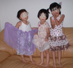 昨日のお友達が急に旦那様が仕事になったらしく急遽一緒にまた遊びました。朝はラブベリにいって、お昼を食べて、午後からは暑かったのでおうちでプール。その後は着せ替えごっこをするする~~ってことで特にうちの子と真ん中子(おないどし)は大喜びで、写真とって~~といってました。うちの子のドレスはベッツィーので、どこにも着ていく時がないのでず~~とクローゼットにかかってました。娘は毎回、これが着たいと言っていつも私を困らせていたんですが、今日ようやく着れたので大喜び。真ん中のお友達はcozy toesのドレス昨年、娘には不評であまり着せていなかったのでお友達に着せてあげたらきゅうに娘が私も!!といってブツブツいってたけど、、。一番大きいお姉ちゃんは半無理やりですけど、娘のBABYNAYが大きく今年は無理だったのでちょっと試しに着てもらったらぴったりです。この服は5歳用なんだけど彼女はもう少しで7歳。やっぱりBABYNAYは大きめなんですかね?とにかく女の子って小さいうちから着せ替えで綺麗になったりすることが大好きなんだなぁ~と思いました。*************関係ないですが私日にちを一日間違ってました。今日は29日なんですね?30日とばかり思っていたので息子の誕生日は今日だと思ってたの。そしたら明日じゃん!主婦になってからど~も日付や曜日にうとくなってしまって、、、。ダメですね。