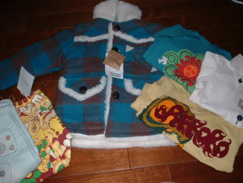 ★clubthemonkeyで購入したもの達~おお~可愛すぎ!娘のワンピと息子のろんTはストアーズのものです。そして帽子はDD。送料入れて全部で10100円!!ありえないくらい安い~~~!購入までにいろいろあったけどそんなことど~でもいいや~。このSHOPさんWEB販売は今日までのようですよ~。ワンピースのスカート部分は裏地がついていて、チラリと裾が見えてとってもかわいいのです。バックプリントもかわいい!!