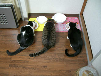 結婚して、我が家はニャンズ×3になりました。旦那様の愛猫が2にゃー(シャンクス & 小春)。私の愛猫が1にゃー(まろん)。合計3にゃーです。6日はシャンクスの4歳のお誕生日だったので、ちょっぴりご馳走にしたところ、みんなで綺麗に並んでもぐもぐもぐ。一心不乱にもぐもぐもぐ。後ろ姿がかわいくて思わず撮っちゃいました 旦那さんと一緒の生活が始まったばかりの頃は、3にゃーとも成猫なので仲良くなるかなぁ...と心配だったけれど1ヶ月ほどたった今は、こうして仲良く?なってくれて安心しました。彼らの姿に毎日癒されてます。これで夏に子供が生まれたら、にぎやかになるなぁ