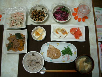 写真はとっていたものの、アップするのを忘れてました。少し前の夕飯。メインはカジキの照り焼きです。お魚は嫌いではなかったけれど、どちらかというと自らすすんで食べる方ではありませんでした。ところが、妊娠してからというもの、時々むしょーに魚が食べたくなります。お寿司も。パパが海育ちだから、お腹のベビーが似たのかな?【おしながき】 かじきの照り焼き かぼちゃのそぼろあんかけ ごぼうサラダ 豆&ひじき 冷奴 はんぺんのねぎ醤油がけ トマト ごはん(雑穀入) お味噌汁 お漬物おかずの数がちょっと多めなので、作るのが面倒な時もあるのですが、血液検査で貧血と診断されたこともあり、いろんなものをバランスよくとれるように頑張ってます。パパさんがお肉が大好きなので、そのためにもなるべく野菜を摂るようにというのも毎日の課題だったりします。