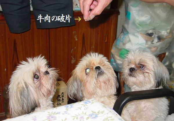犬たちの好きな物。それは肉!牛肉でも豚肉でも鶏肉でも何でも良い!肉なら何でも良い!夕食に焼肉でもしようものなら、彼女らの頂戴光線を家族は皆浴びることになる。この強烈な頂戴光線には、何人たりとも逆らえない。そして肉は、少しずつではあるけれど、彼女達の口に入ることになる。彼女達の口に入る寸前の写真を撮ってみた。笑えるほど、彼女達の目は真剣だった。我先にが手に取るようにわかる写真になった。可愛すぎる!