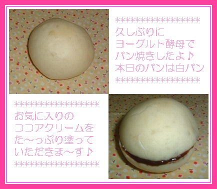 今日はとってもいいお天気でしたね暑くってバテたけどジメッとしてるよりはずっといい気分洗濯もカラッと乾くと気持ちいい~。。。そんな私はいつもより気分良くパン焼き開始です←単純(笑)今日はめっちゃめちゃ久しぶりにヨーグルト酵母で『白パン』焼きました(*≧▽≦)σみてみて~白くってコロンとした可愛いパンの出来上がり酵母パンってイーストのパンより焼き色つきにくいんやぁ Σ(ОД○*)イーストの場合はしょっちゅうオーブンの中を覗いて焼き色がついてきたらオーブンシート乗せたり大変やったけど酵母パンはそんなに気にしなくて良くて楽チンでした白パンに『バンホーテンのココアクリーム』をた~っぷり塗って食べるのが最近の私のお気に入り♪白くてふんわり・もっちりのぱんにこの甘さ加減が絶品(。-∀-)ニヒこのクリーム生協で買ったんやけどほんま大当たり見かけたら是非 試してみて!!今度は2つ3つ買い溜めしとかなあかんわぁ(笑)ポチッとワンクリックお願いします^^