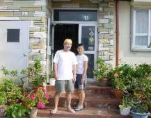 波照間行きの船が無事出港。波照間に渡るには豪華客船といわれる波照間海運の「ニュー波照間」と漢(おとこ)の船といわれる安永観光の2つ。もしくは飛行機。私は漢の船を選択。しかし、台風15号の動向が気になる。帰りの心配。14号の発生した地点より西ということは・・・沖縄に近いんです。で、現在の気圧配置から察するに、高気圧の位置がヤバイのよ。八重山直撃と言う予感・・・予定は9日の最終便で波照間を離れ、石垣、那覇、東京の予定だが・・・ま、なんくるないさ!行ってから考えよう。波照間行きの船は風は多少強いものの、ウネリもなく揺れも少なく順調に航行。およそ1時間で到着。「おひさしぶり~はてうるま!」はてうるま:うるま=珊瑚礁 珊瑚礁の果ての意民宿の送迎、見送りが来ている。今回は初体験の「けだもと荘」「たましろ」はいっぱいだったので予約が取れなかった。さてと、「けだもと っと・・・」あれ?どこ?あ、いたいた。看板持っててよ~車に乗り込む。に~、し~、ろく、六名。宿泊台帳に記入して部屋に案内される。1人なんで相部屋です。今日はそれぞれ一人旅の3名と相部屋です。もうすでに5時。