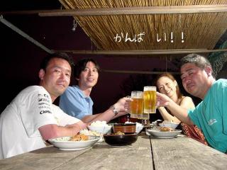 やっと夕食です。当然、オリオンでかんぱ~い!!!昨日までの旅・・・今日のこと・・・明日からの予定・・・話は尽きない。I氏が泡盛を提供。オリオンビールもうまいが、シマー(泡盛)も格別だ。そういえば・・・来るときに一緒の船だった人、「泡盛3本持ってきたから、マイトウゼにお邪魔させてください」って言ってたよね?一同「うんうん、言ってた」まだ来ないのかなあ・・・じゃあ、そろそろ三線でも弾きましょうかね?「まってました~」(パチパチパチ・・・)一気に場が盛り上がる。いいなあ・・・満天の星空のもと、波の音が聞こえ、シマーを飲みのみ三線を弾く。みんなの手拍子、歌声が沖縄の夜空に響く。たまらんのお。それにしても遅いなあ・・・Sさんが一旦部屋に戻った。すぐに戻ってきて、2人連れてきた。そう、泡盛持参の彼である。もう一人は同宿(ぽっぽ)の彼で、同じ郵便船に乗っていた。どうやら、ぽっぽには他の宿泊客がいるにはいるのだが、中国語か台湾語らしく、泡盛とグラスをもって出てきたらしい。なぜもっと早く来ないのよ~といったら、マイトウゼには私たちのほかにも宿泊客がいっぱいいて盛り上がっていて、ぼく達は仲間に入れてもらえないかと思って、港で二人で飲んでいた・・・だそうな。いいかげん寂しくなってウロウロしている所に彼女とバッタリ会ってついてきた。という具合。なるほど・・・もう一人の彼女は?そう、今日一緒に乗ってきた郵便船には7人乗っていた。マイトウゼの4人、ぽっぽの2人と青空荘の一人。呼んでこようよ~と呼びにいったらバッタリ会ったらしく、7人揃った。男女7人物語~(古すぎ?)ヒラりんトークが炸裂し、あっという間に11時の消灯時間。宿泊棟に移動。もう、みんな出来上がっていて、たのしいのなんの。時間も忘れ飲んだくれちゃいました。深夜1時。そろそろお開きにしましょう・・・握手を交わし、各々の宿へ・・・さてと・・・私はヤシガニ探しにいきますよ~みんなの「え?」という反応をよそに「だって、明日は島を離れるから今日しかチャンス無いもん」「そーだよねー」って結局4人で出発!新月の為、懐中電灯のみが頼り。中森を通り、島仲道へ。「ヤシガニいるかな~」なんて心配をよそに・・・いたー!Sさんが発見!こいつがヤシガニかあ・・・とりあえず捕獲。島仲浜手前で同サイズのを発見。またしても発見者はSさん。外若浜付近の茂みにまた発見!さっきのよりサイズがおおきい。発見者はSさん。女性とは思えぬ視察力だ。蛇もいた。が、鳩間島にはハブがいないので安心だ。またまたSさんが4匹め発見。わらしべ長者のごとくサイズが大きくなってゆく。さっきのを逃がし、大きいのを捕獲。それにしても男性軍は頼りない。すべてSさんだよ・・・船原浜近くで最大級発見!!!おおきい。うひひ・・・明日朝食に出してもらおう。5匹もいたよ~宿に帰るともう3時だった。とりあえず、ヤシガニ君はシャワールームに閉じ込めておこう。「おやすみ~」長くて短い鳩間の一日が終わった。