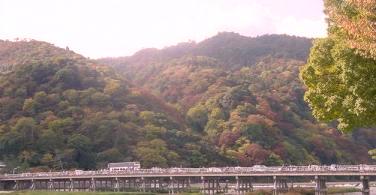 夕べの同窓会の夢うつつ・・・朝起きると、もう雨は上がっている。雲の合間から青空が覗く。天気は良くなりそうだ。宿をチェックアウト。さてと・・・ちょっとウロウロして東本願寺に。改修工事をしていたが、なんともスケールが大きい。天気は完全に回復し、とてもいい天気。あまりに天気がいいので、嵯峨野に行ってみることに。バスに乗る。嵐山に到着。嵐山の代名詞ともいうべき渡月橋。京都には舞妓さんがよく似合いますな。いいショットでしょ?天竜寺のモミジもすっかり赤くなっています。しかし人が多いなあ・・・嵐山羅漢の像が物々しい。天竜寺の裏手へ抜け、竹林道を通り、さらに奥へ。途中、畑が広がり、「落柿舎」(らくししゃ)がある。田園風景が広がり、今までとはまったく違う場所へ来てしまったかのような錯覚に陥る。「落柿舎」は松尾芭蕉の一番弟子が住んでいて、嵐山からの風で一晩のうちに大事にしていた柿がすべて落ちてしまったという伝説が・・・と人力車のおにいさんがお客に説明している。落柿舎を横目に常寂光寺へ。私が京都の中で一番好きなとこかも知れない。常寂光寺の山門。もう少しするとこの木の葉が鮮やかな黄色になって、とてもいい雰囲気になる。急な階段、坂道を上り、多宝堂へ。さらに登る。そうだ!京都へ行こう・・・CMにでも出てきそうな風景だ。モミジとお堂の向こうに嵯峨野の市街が見える。絶景かな。