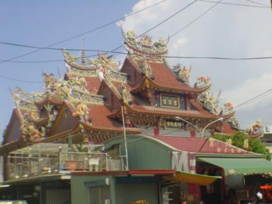 朝食にも悩まされる。味噌汁も甘い。料理はやはり臭い。トマトジュースがなぜ甘い?こういう味の街なのね・・・さて、観光。蓮池□(字が出てこない)大きな池の北側には孔子廟、南に龍虎塔と春秋閣が建つ。その湖というか、池というか、沼というか・・・7万平方メートルもある。南側を歩いていると、怪しげな音楽と歌声が聞こえてくる。 保生大帝(薬の神さま)を祀る『慈済宮』。音楽にあわせ立ったり跪いたりして拝んでいる。 『慈済宮』に向かい合わせるように『龍虎塔』。くねくねと曲がった回廊を渡ると龍と虎が口をあけている。 龍喉。この二つの塔は繋がっていて、龍から入り、虎から出るそうだ。 龍の塔から望む。右上に見えるのが『慈済宮』、中央は回廊、左下が虎喉。なかなかのアングルで撮れたワイ。ここは塔がライトアップされ、夜景がとてもきれいだという。ここは訪れる価値ありです。