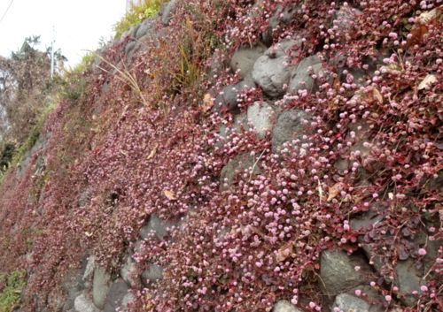 ピンクの小花をいっぱい付けた雑草が張り付き、群生していて、
