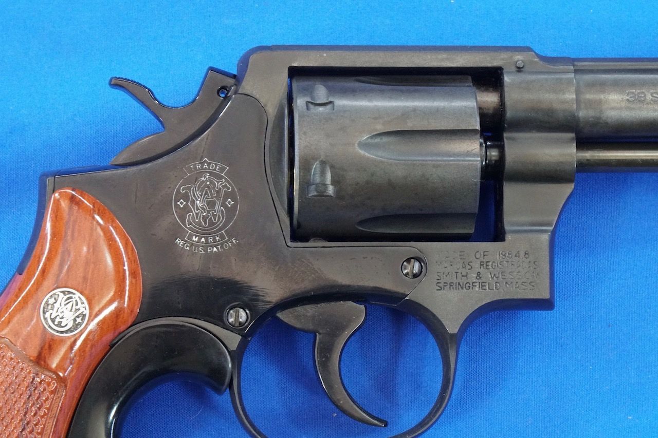 サイドプレートのS&Wロゴはホワイトが入ったようになっています。トリガーはスタンダードタイプの細いもの。M13はセミワイドタイプになっているので昔から差別化している部分です。フレーム刻印は「MADE OF 1984.8 MARCAS REGISTRADAS SMITH & WESSON SPRINGFIELD,MASS,