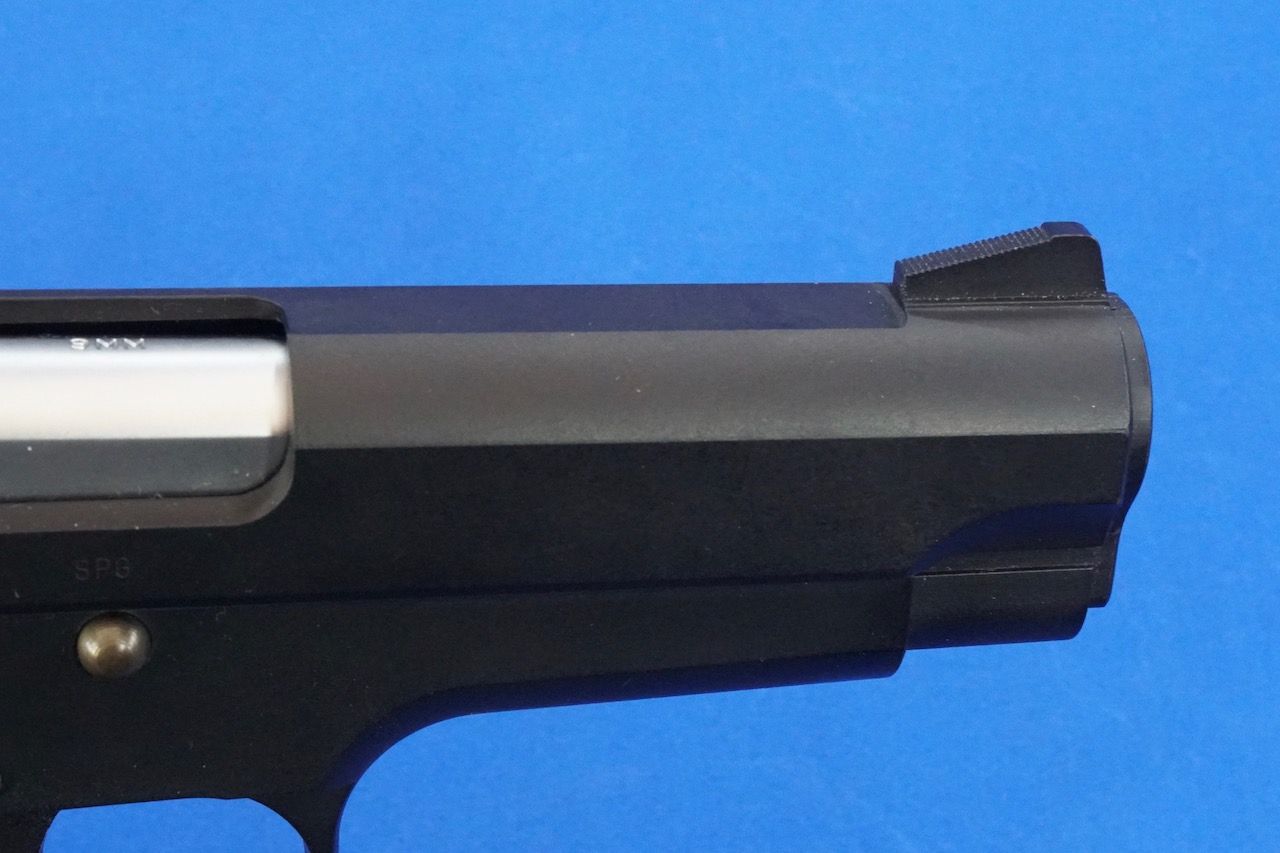 刻印はスライド左側のみに打たれていますが、前方から「 SMITH & WESSON」「MADE IN JAPAN」「MARCAS REGISTRADAS SMITH & WESSON SPRINGFIELD,MASS」となっています。後半の意味は「登録商標 S&W社 スプリングフィールド工場 製造」でしょう。