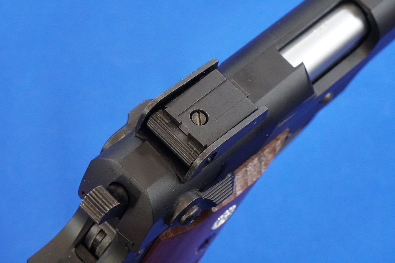 リアサイトは上下・左右調整可能なガード付きで、フロントサイトはリアサイトに合わせて高さが高くなっています。リアサイトはガスガンのものをそのまま流用したようですが、クリックが左右だけだったのに気づき驚いています。上下スクリューにもクリックがあったように記憶していたんですけどね。