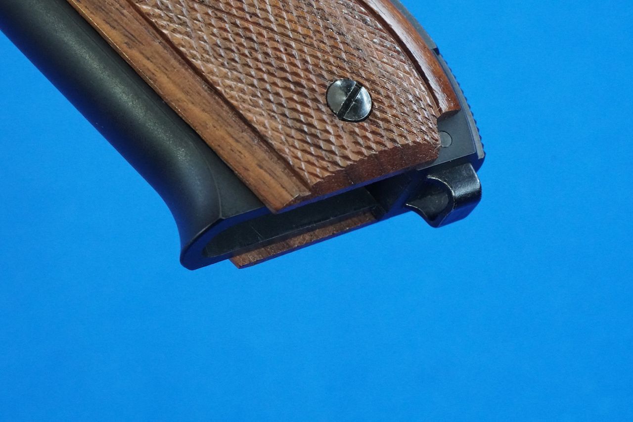 グリップはMGC純正の木製グリップ。最初はプレーンなものだけで、チェッカリング入りは後から追加された様に記憶しています。MGCの木製グリップは90年頃から急にデキが良くなって、チェッカリング加工とかも綺麗になった印象があります。