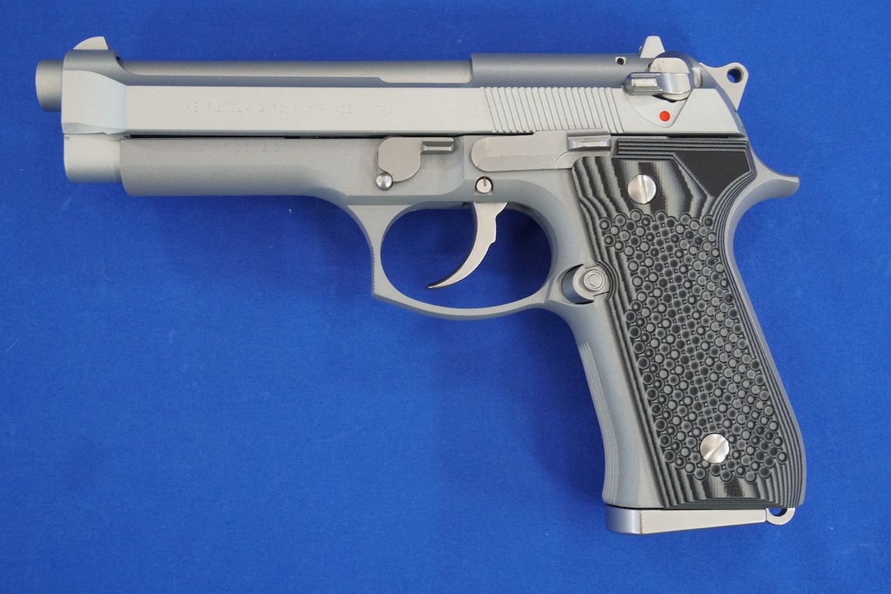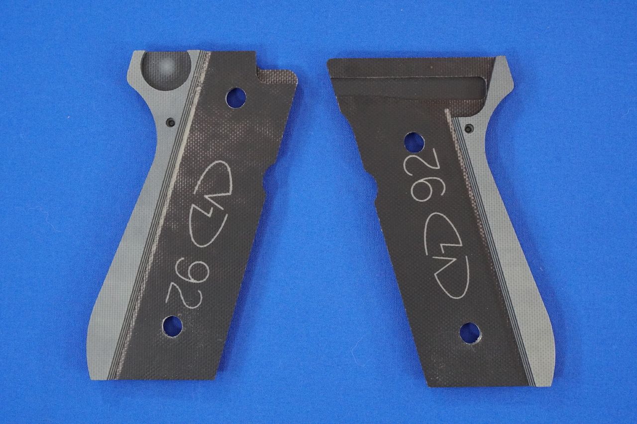 正式なグリップ名は「92 Golfball Black Gray G10」というもののようです。同じシリーズの「Marsoc」というブラック&グレイに茶の入ったタイプが欲しかったんですが、今回タナカのM92F INOXに付けるにはブラック&グレイの方が似合う感じです。