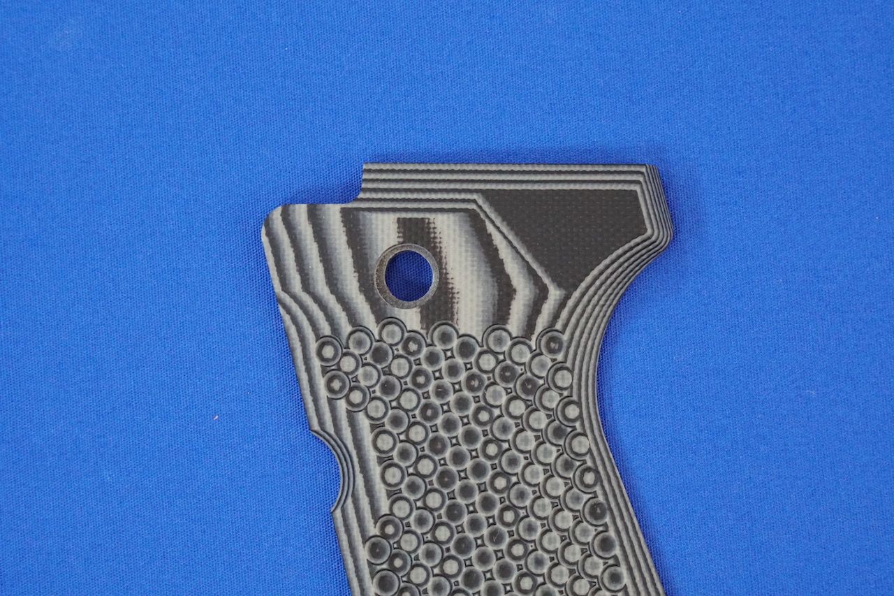 グレイとブラックのG10素材の積層なのが、裏から見るとよく分かります。ラージハンマーピンのFSモデルにも当然対応しています。トリガバーやスライドストップレバー用の溝も綺麗に加工されています。最近の加工技術は凄いものがありますね。