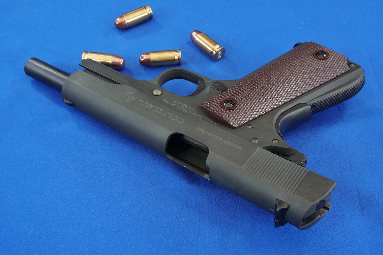 スライド右側もコマーシャルモデルと同じ「COLT AUTOMATIC CALIBRE.45」とランパントコルトマークに「MARINA ARGENTINA」の1行が入っています。この一行が同じバリエモデルのコマーシャルミリタリーのスライドとの唯一の違いです。