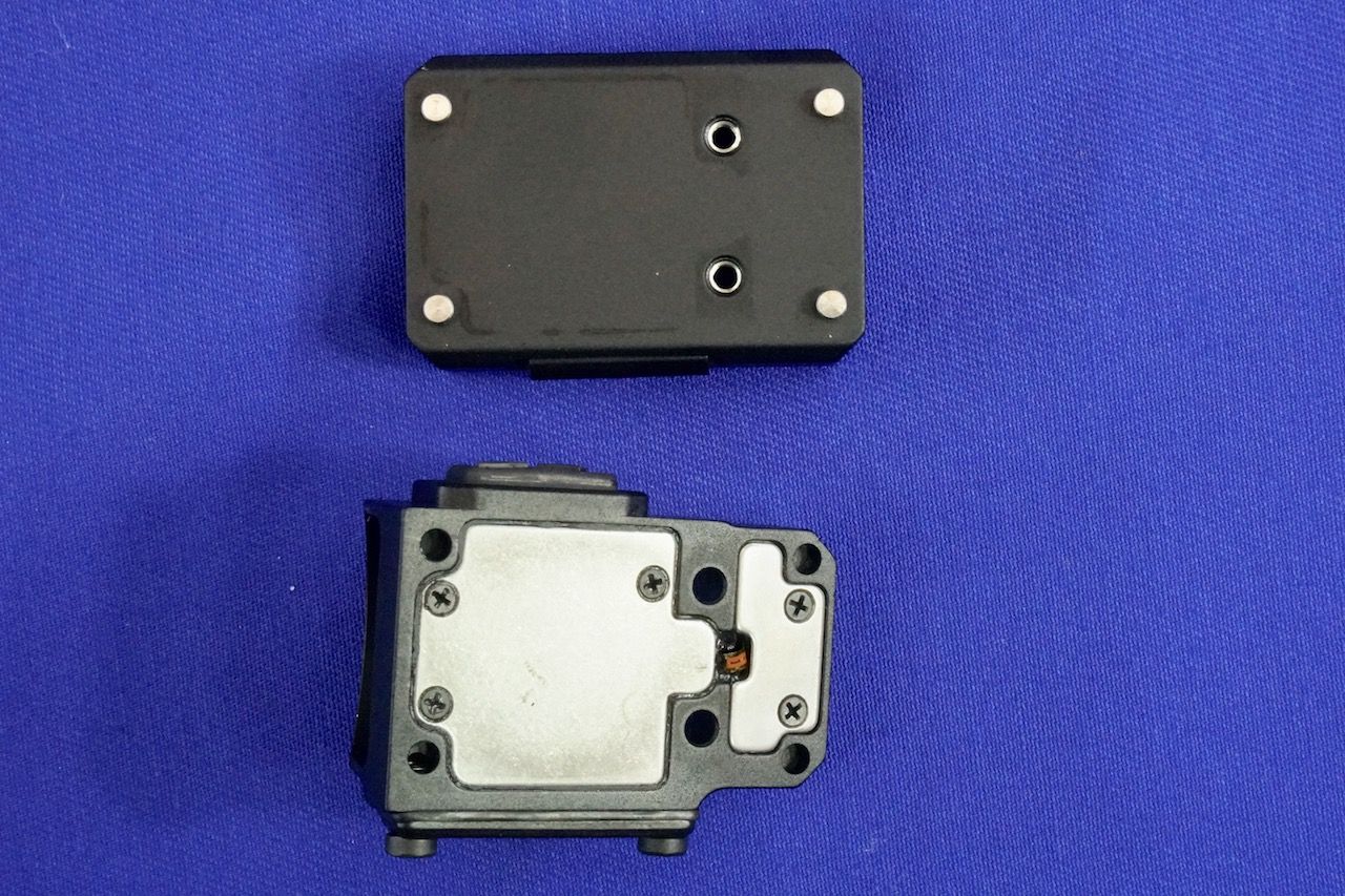 同種の実銃用マイクロサイズドットが本体とマウントの間にバッテリーを挟む構造なのに対して、MRSは本体内にバッテリーを納め、本体単体が防水構造になっています。画像のように本体とマウントを分解してもバッテリーが露出しないのは安心感がありますね。