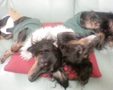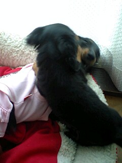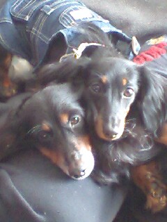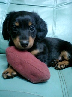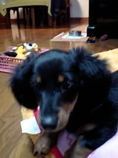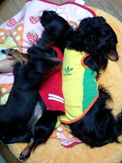 突然ですが~ 日曜日に新しくワンコが仲間入りしましてぇ~ とうとう 3ワンとなりました よろしくお願いしま~す 名前は KERORO です。 けろたんと呼んでくださいませ さっちゃん担当のわんこ(♀)です。 ケロロ軍曹大好きのさっちゃんの命名なんですけど、 ねねちゃんには大変とってもMAX 不評 です。(-"-;) うっ... 3ワンになる予定はまったくなかったんだけど、 2月に、ダンナが仕事で知り合った人のおうちにも、ダックスが3ワンいて、 しかも4ワン子供が生まれたって言う話を聞いていたらしいんだけど、 もらってくれるお家がなかなかみつからなかったみたいです・・・(*゚∀゚)(*。。)(*゚∀゚)(*。。)ウンウン おかあさんわんこが最近育児放棄するので母乳ももう飲まないから、 1ワンつれてってと頼まれたダンナ様・・・ それが1週間位前の話で~、それにさっちゃんが食いついちゃったんですよ~ さっちゃんいわく 「あたしも一緒に寝るわんこ欲しかったのよぉ~~ラッキー」 いいんでしょうか こんなに簡単に決めちゃって うちはいつも昼間はお留守番だし、けろたん を幸せにしてあげられるんでしょうか なんて考える暇もなく、忙しくしている私を尻目にあっという間にお迎え準備が進められ、 日曜日となったのでした~~~~ (#^.^#) でもね、けろたん を抱っこしたら、かわいい~の この子のために、また頑張りましょ って思えちゃうから凄いよねぇ。 さっちゃんには 「犬の十戒」 を再度読んでもらって、 けろたん の実家の方にも宣誓してもらいました。 ☆⌒(*^-゚)v すでに2晩たったけど、けろたんの夜鳴きでなかなか寝られませんでした・・・ あと1週間は続くんでしょうね~。 お昼休みもしばらくはお家にかえって離乳食と様子みしなくちゃ・・・です。 ちなみに、バーディーとノアはかなり戸惑ってます。 バーディーは、「またぁ~、お願いだからお昼寝のジャマしないでよね」 って感じ。 ノアは 「だれだれなのアタチのうさちゃんとらないでよぉママなんとかしてぇ~」 って感じで、ず~っと けろたん の後をついてまわってます。 ちょっとストーカーっぽいですよ。 (≧~≦))ププ バーディーもノアも、しばらく疲れるだろうけど、仲良くしてあげてね ゴキゲンなさっちゃんのお腹の上で、はいポーズ のはずなんだけど、 これって今の気分がマジ出てるって感じで、みんなで笑っちゃいました。B「写真かぁ、がまんがまん」 K「アタチ主役よ」 N「アタチ、おりるぅ~」