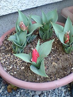 お久しぶりです。(^^ゞ 朝、この日記を書いていたら突然固まりかけたので、 あわてて下書き保存をポチってしたんだけど、 ぜ~~~~~んぶ、消えちゃいましたぁ~~~ あと少しだったのに・・・ ホンと何なんでしょ 今日はついてないかも 先日はノアの『偽妊娠』のことで、ご心配おかけしました。m(__)m ミルクモレも2~3日でおさまり、一安心です。 いろいろ教えていただいて、本当にありがとうございました。 とりあえず、去勢はしない事になりました。 人間もそうですけど、運命っていうか、流れっていうか、 そういうものに任せましょ って思っています。 今、仕事がMAX忙しく、毎日8時まで残業もしているので、(ーー;) お返事サボって ゴメンナサイ ~~~~~~~~~~~~~~~~~ 春ですねぇ~ って事で、ウチのチューリップ、見てください。 なんか変ですよねぇ。これって失敗 葉っぱも茎も伸びてないのに、お花咲いちゃいましたぁ~~~ こっちが特に変ですゥ こっちはまだ少しいいです 何でこうなっちゃったのか、よくわかりましぇ~~~ん。 チューリップは毎年植えるんですけど、今年だけこんななんです・・・ やっぱり今年も、まだまだ苦難が待ち受けてるのでしょうか~~はぁ~~