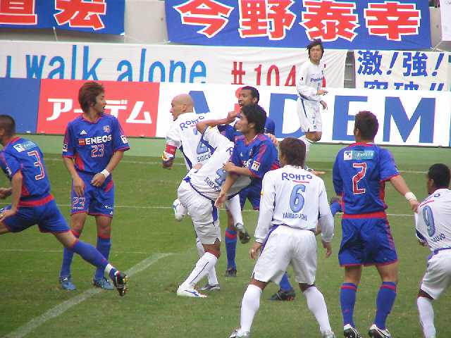 先週の試合の写真をアップします。自分が観戦したFC東京対ガンバ大阪(味の素スタジアム)です。試合結果はこんな感じです。遠藤のCK、シジクレイのゴールでゲームは幕を開けました。遠藤のFKを抑える阿部。先取点こそ奪われたFC東京でしたが・・・その後はペースを取り戻し攻勢に出ます。中でも藤山の上がりは見事でした。前半は0-1で終了するかと思われましたが・・・馬場憂太の豪快なミドルシュートが決まり1-1。ゴール右ポストに当たる美しいゴールでした。写真は喜びを爆発させる憂太と祝福する東京の選手達。ハーフタイムでベンチに戻ってきてもスタッフに祝福されていました。後半は東京が優位に試合を進めます。ゴールこそ奪えなかったもののルーカス、鈴木規郎が何度も決定機を作ります。均衡が破れたのは71分CKのこぼれ球を今野がねじ込み勝ち越しゴール。写真は喜びを爆発させる今野。ボールがまだ、ネットに揺れています。凄い喜び方でした。ネットに隠れてしまい・・・あまり良くわからなくてごめんなさい。ゴール後今野に駆け寄るFC東京イレブン選手が駆け寄ったのが「石川直宏」の横断幕の前だったのは、単なる偶然でしょうか?ついでに今野が、最初に止ったあたりは招待のサッカー小学生席のところ感動的なシーンでした。サッカー少年達には思い出に残る試合になりましたね。試合はそのまま2-1でFC東京が首位ガンバを下しました。写真は試合終了直後に梶山と肩を組みながら引き上げるルーカス・・・カッコイイ!!ガンバを下して本当にうれしそうなFC東京の選手達試合後の選手の挨拶。引き上げてくる土肥、茂庭、栗澤、梶山・・・本当にうれしそうです。選手の挨拶の時に、原監督が混ざるのがこのチームのいいところです。この日のゲームは、本当に楽しかった!!今年の味の素スタジアムでの観戦はこの試合が最後になりますが・・・梶山、憂太など若い選手の台頭もあり・・今年の集大成を見た気分になりました。来年もまた、時間を作って観戦したいですね。これからは全てレッズ戦です。その浦和レッズ対川崎フロンターレは疲れたので(おいっ!)また明日・・・