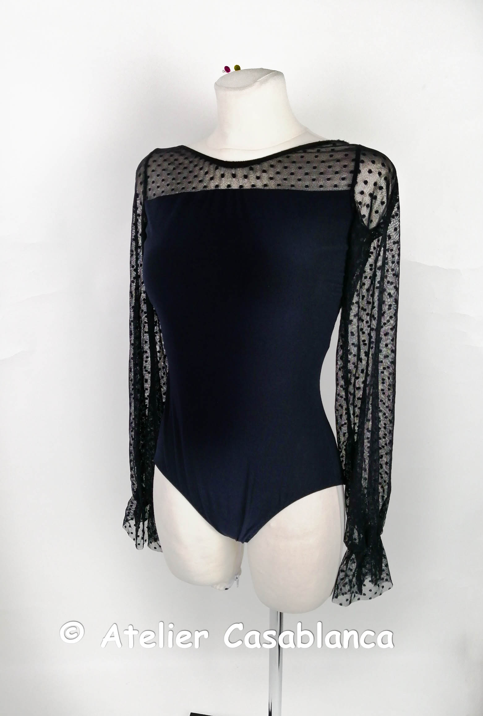 こちらのウェアはお譲りする方が決まりました。ありがとうございました。ブラックプールセミファイナリストのタイトルを持つウクライナのトップユース選手のためにウクライナでフルオーダーで制作された一点物の黒の長袖のレオタードです。肩から腕にかけて細かいベルベットのポルカドット柄が美しいメッシュ素材を使っており、袖がゆったりとしていて袖口が絞られていてフレアになっているので、二の腕がとてもきれいに見えて汗じみも目立たない大変おすすめのウェアです。ブラカップが入っているので、背中が開いていますが安心してご着用いただけます。デコルテラインの切り替え部分はボートネックになっています。背中はある程度出したほうがホールドしたラインがはるかに美しく見えるのでおすすめです。ストレッチ素材の9号です。丁寧な縫製で、非常に着心地が良いストレッチジャージ素材とメッシュを組み合わせており、ストレッチたっぷりなのでとてもストレスなく着られるおすすめのウェアです。黒なので合わせやすくとても便利です。6800円です。