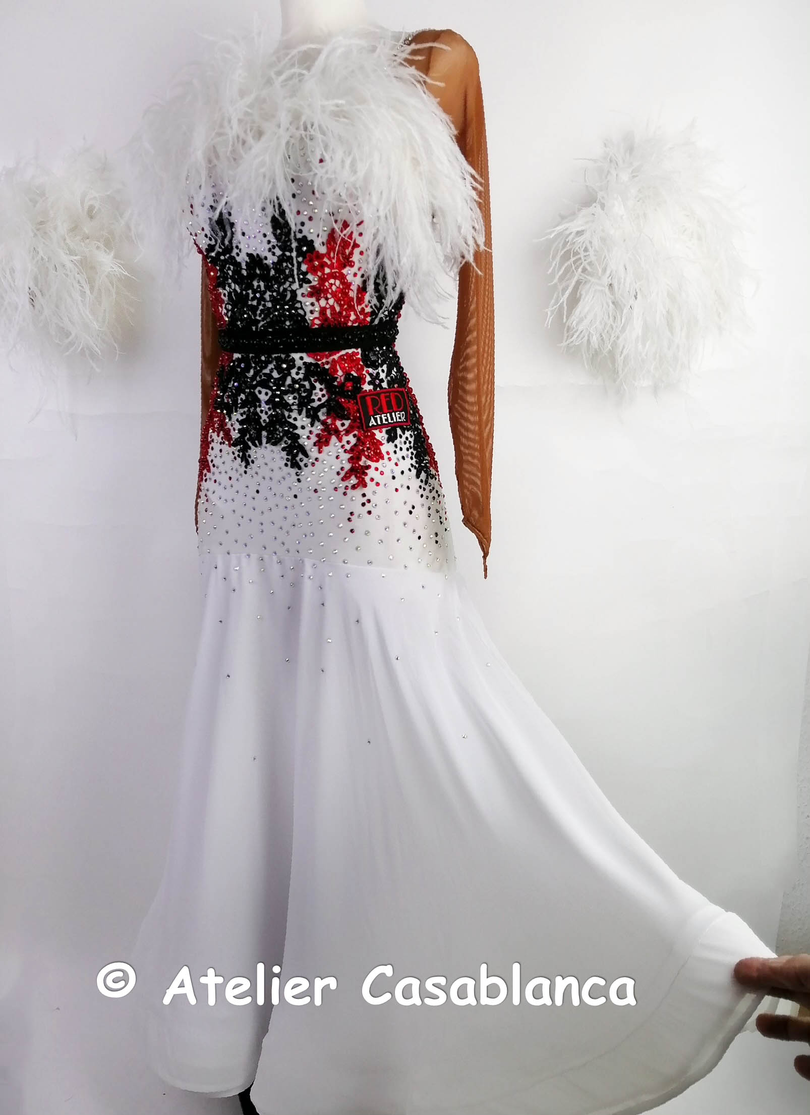 ロシアの大変素晴らしいダンスドレスブランド、「レッドアトリエ」が制作した、ボディの赤と黒のレースモチーフ使いが大変美しい、黒と白のオーストリッチの羽の飾りをボタンでチェンジすることができ長袖のスタンダードドレスです。縦のラインを出すように赤と黒のレースモチーフの装飾があるので、とてもスタイル良く見せるデザインで、黒のベルトでウェストをマークしているので大変ほっそりと見えるデザインエス。ベルトはドレスと一体型になっています。黒と白のオーストリッチの羽をデコルテラインと袖につける構造になっており、デコルテラインの羽はスナップボタンで取り外しが可能で、色をチェンジすること阿賀できます。スカートはジョーゼットを3枚重ねており、裾にはホースヘアが入っています。軽くて大変良く踊る、ラインの美しい大変上品なドレスです。スカート丈はウェストから約82センチで、身長155ぐらいの方から対応します。非常に縫製が丁寧で、ロシアでは大変人気のあるブランドでデザイン性も高く品質の高い素晴らしいドレスです。スポンサードレスとして制作されたため、ヒップの所にレッドアトリエの大き目のロゴが入っています。サイズはストレッチ素材の9号です。135000円です。日本にありますので、ご試着をご希望の場合にはすぐにご案内可能です。ウェブサイトに引っ越しておりますが、掲載内容はウェブとブログとまったく同じです。こちらのブログには引き続き新着情報を掲載していきます!インスタグラムはこちら: Ateliercasablancagermany どのサイトからお申込みいただいても大丈夫です。メールでのご連絡でも大丈夫です。下記のロゴをクリックしてください。こちらからもご試着お申込みいただけます:申し込みフォームからうまく送信できない場合には、casablanca.germany@gmail.comにご連絡ください。LINEはこちらです。ご質問がございましたらご連絡ください。Wifiがあるところでしか確認できないので、タイムラグが生じることがあります。