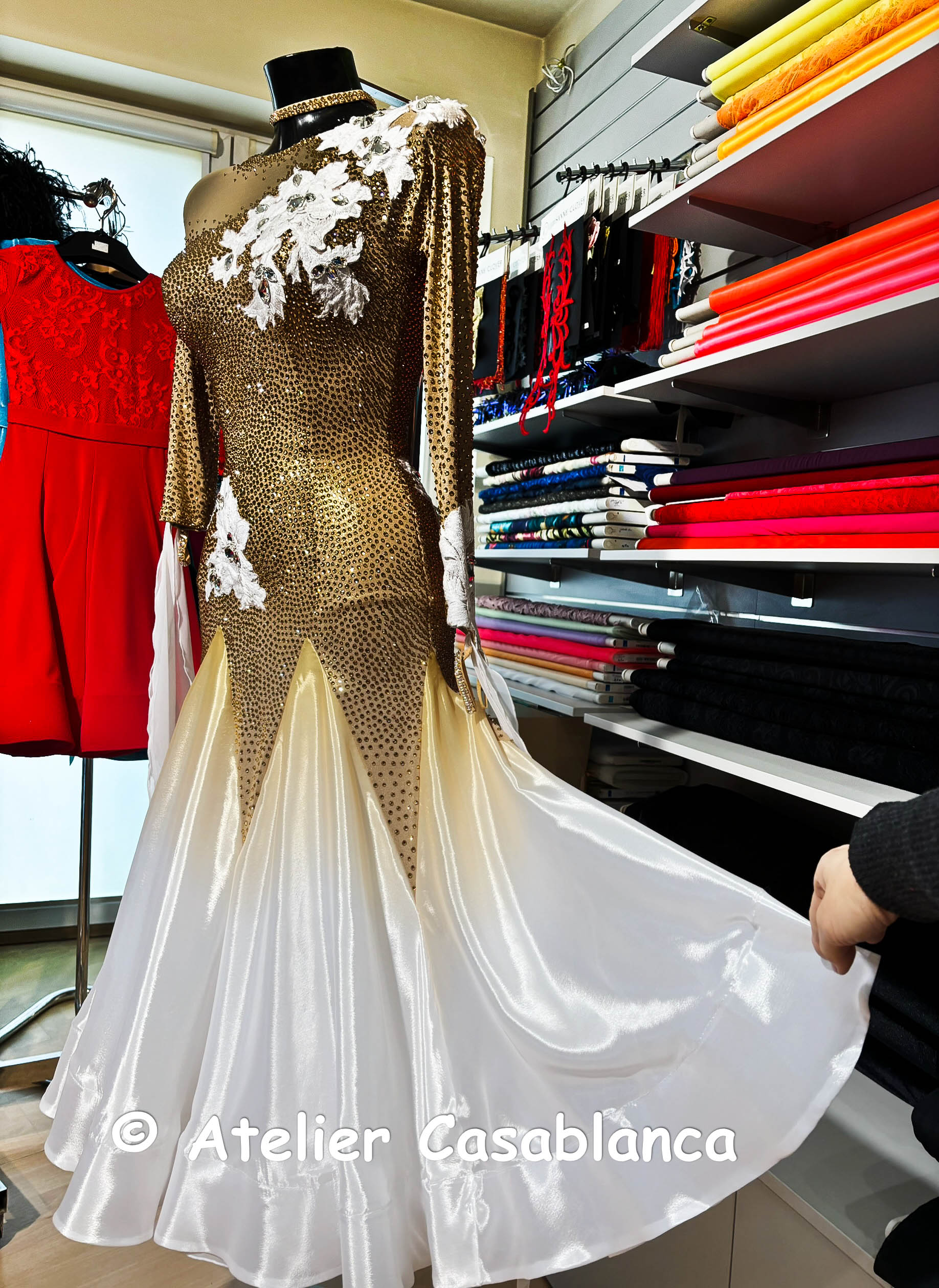 ポーランドの大変素晴らしいラグジュアリーダンスドレスブランド、「マラボ」制作の、ゴールド~白のグラデーションが大変美しい長袖の石びっしりのスタンダードドレスです。未使用の新品。ボディ部分はワンショルダー風のデザインでスタ肩や背中がメッシュで覆われていて背中の露出がないデザインになっており、ゴールドのボディ全体にはクリスタルゴールデンシャドーの石がびっしりと貼られていて大変美しく豪華に輝きます。左肩から胸のラインにかけて、そしてヒップラインに斜めのラインを出すように装飾された白のレースモチーフが大変上品で美しく、ゴールドと白のコントラストが大変美しいデザインです。モチーフ上には大きな縫い付けるタイプのクリスタルの石の装飾があります。ゴールドの布は光沢が美しいフォイルプリントのエンジェルスキン素材を使っており、大変輝きが美しいドレスです。スカートは非常に珍しいゴールドから白のグラデーションのパールシフォンを使っており、その下にジョーゼットの白のスカート、さらにオーガンジーでパニエのフリルがダブルになったアンダースカートを重ねており、スカートのボリュームもたっぷりで大変良く踊るドレスです。白のパールシフォンの細いフロートは石びっしりのバングルで固定するデザインです。背中が開かないので、タンニングをされない方、背中をあまり出したくない方にお勧めの、とてもエレガントでラグジュアリー、ラインの美しいスタイリッシュな素晴らしいドレスです。サイズはストレッチ素材の9号で、ウェストからはかったスカート丈は81センチと短めなので、身長150センチ―157センチぐらいまでの方に対応します。非常に丁寧な縫製で、使われている布はすべてクリスアンクローバー。石はプレチオサで、大変品質の良い素晴らしいドレスです。16万4000円です。ウェブサイトに引っ越しておりますが、掲載内容はウェブとブログとまったく同じです。こちらのブログには引き続き新着情報を掲載していきます!インスタグラムはこちら: Ateliercasablancagermany どのサイトからお申込みいただいても大丈夫です。メールでのご連絡でも大丈夫です。下記のロゴをクリックしてください。こちらからもご試着お申込みいただけます:申し込みフォームからうまく送信できない場合には、casablanca.germany@gmail.comにご連絡ください。LINEはこちらです。ご質問がございましたらご連絡ください。Wifiがあるところでしか確認できないので、タイムラグが生じることがあります。