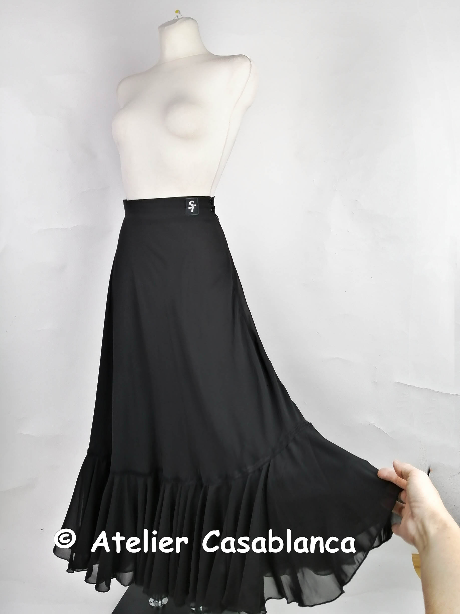 ユースブラックプールチャンピオン、UK戦チャンピオン、世界チャンピオンのタイトルを持つ超素晴らしいウクライナのスタンダードダンサー、ソフィア・アルバ選手所有の裾のフリルが大変美しい黒のスタンダード用スカートです。ウクライナの超素晴らしいドレスブランドで、アトリエカサブランカでも常に非常に人気のあるステッシュアトリエの制作。ジョーゼットを2枚重ねて制作されており、ストレッチ性がないですがサイドにファスナーがあり、とてもエレガントで軽やかな動きと裾のフリルが魅力のウェアです。ジョーゼットを2枚重ねているので透けません。大変ラインが美しく、ジョーゼットを2枚重ねるという大変珍しいつくりのウェアで、とてもスタイル良く見えます。外側のスカートにはホースヘアが入っており、フリルの切り替えの部分にはベルベットのラインが入っています。サイズはストレッチ素材の9号で、トルソーはウェストが65センチでちょうどでしたので、ウェスト65ぐらいまでの9号サイズの方に対応します。スカート丈は89センチです。9500円です。ウェブサイトに引っ越しておりますが、掲載内容はウェブとブログとまったく同じです。こちらのブログには引き続き新着情報を掲載していきます!インスタグラムはこちら: Ateliercasablancagermany どのサイトからお申込みいただいても大丈夫です。メールでのご連絡でも大丈夫です。下記のロゴをクリックしてください。こちらからもご試着お申込みいただけます:申し込みフォームからうまく送信できない場合には、casablanca.germany@gmail.comにご連絡ください。LINEはこちらです。ご質問がございましたらご連絡ください。Wifiがあるところでしか確認できないので、タイムラグが生じることがあります。
