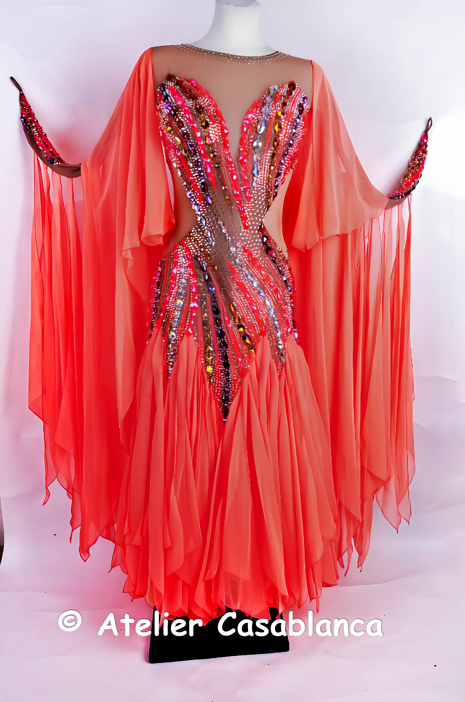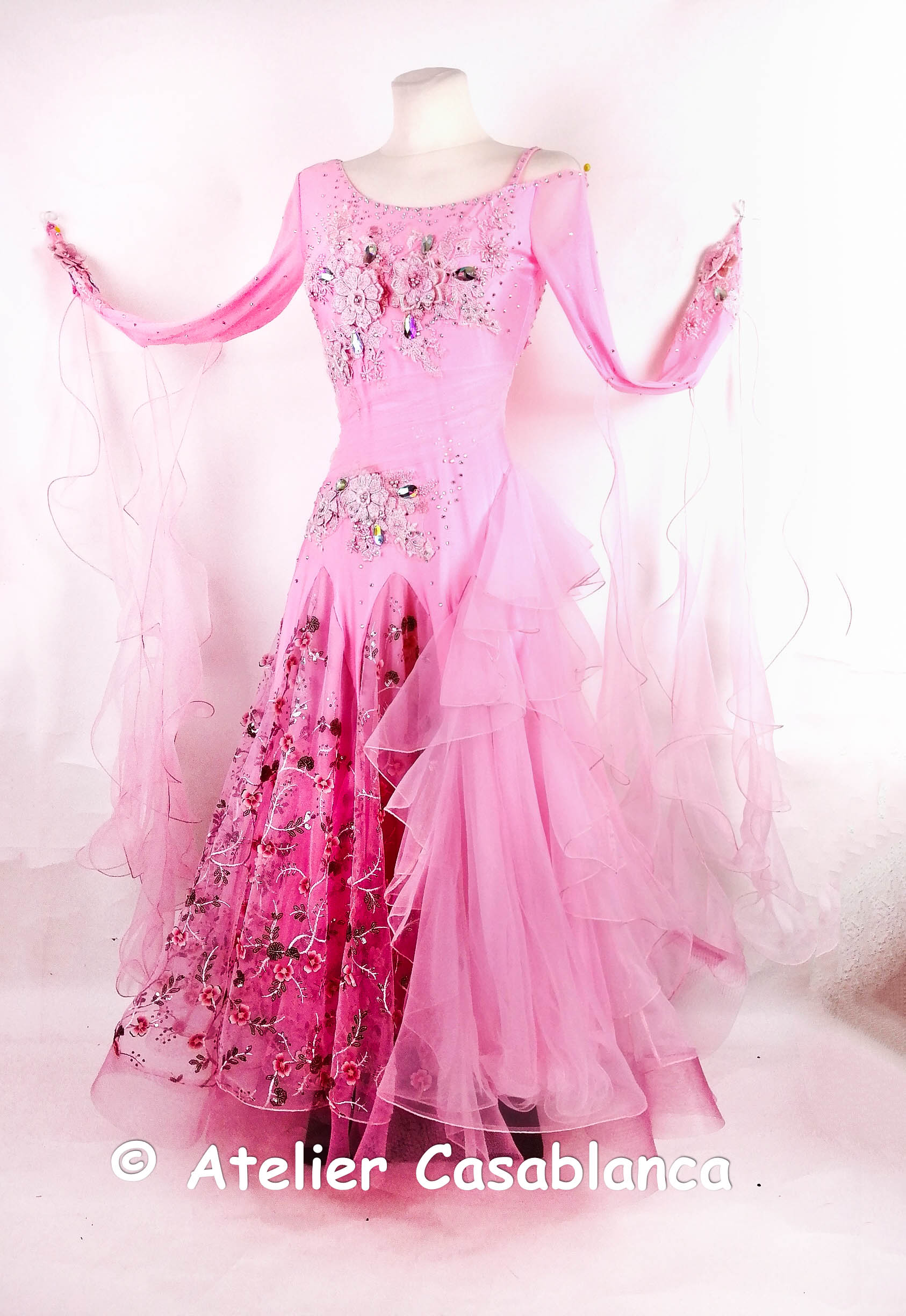 こちらのドレスはお譲りする方が決まりました。ありがとうございました。ブラックプールチャンピオン、世界チャンピオン、UK戦チャンピオンのタイトルを持つ超素晴らしいウクライナのスタンダードダンサー、ソフィア・アルバ選手のためにウクライナのラグジュアリーダンスドレスブランドで、アトリエカサブランカでも常に大人気の「カタリーナ」が制作した一点物の大変美しいカーネーション色の石なしのスタンダードドレスです。ソフィア・アルバ選手が踊っているときのデモの映像をアトリエカサブランカのインスタグラムの方にアップしています。デモ用として制作されており、色は春らしいピンクが美しいカーネーション色。ホルターネックでゴールドのチェーンがアクセントになったデザインで、ベルトはお好みの形につけることができるので工夫次第で色々なつけ方ができます。スカートは現在大人気の裾がジグザグになった新デザインで、ボリュームを出すためにスカート全体にフリルをたっぷりとつけており、非常にゴージャスで美しく踊るドレスです。ストレッチライクラ素材と光沢が美しく、かつ軽くて透けないおすすめの布、「アルマーニシルク」をスカートにつかっているので動きがとても軽やかです。カーネーション色も非常に珍しく、ロンググローブのフロートのデザインも美しくて大変豪華に踊ります。レオタード内蔵型でクロッチ部分はホックで開閉式になっており、ブラカップも内蔵されています。サイズはストレッチ素材の9号ですが、7号の方にも対応します。スカート丈は最も長い部分でウェストから約86センチなので、身長156センチぐらいの方から対応します。デモで2回だけ着用された大変良い状態のドレスです。フロートを使わなければレッスン用ととしても使えますし、ベルトはなし、もしくはほかのものを使うことも可能です。