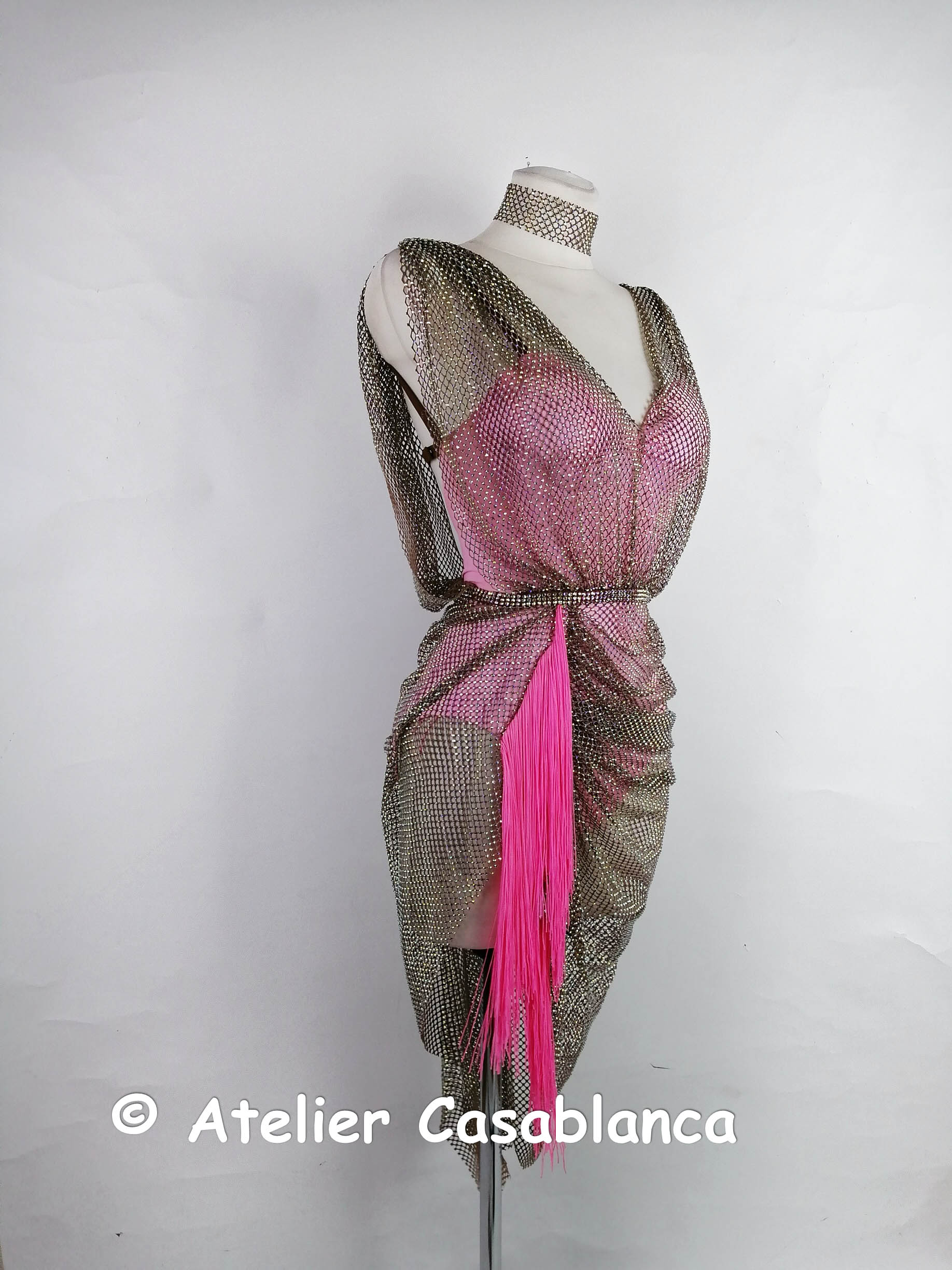 リトアニアの選手のためにリトアニアで制作された、オーロラの石がびっしりの粗いネットを使ったドレープが大変美しいピンクのラテンドレスです。ピンクのレオタードの上に全体にオーロラの石がびっしりと貼られたベージュの粗いネットの布を重ねており、ボディのたわむデザインが動きを出し、スカートのドレープが大変スタイル良く見せてくれます。アシンメトリーなデザインで体のラインがとても細くスタイル良く見える視覚効果があります。ピンクのオーロラの石びっしりのベルトはドレスと一体型に名ています。スカートのピンクのロングのフリンジがとてもよく踊り、アクセントになっています。石びっしりの粗いネットで制作されたチョーカーと手袋(手のひら部分は石がありません)、ピンクのわっかのタイプのピアスが付属しています。ドレスはきれいにクリーニングされていますが、若干タンニングの跡が見受けられます(ネットがかぶさっているので全くわかりません)サイズはストレッチ素材の7-小さ目9号です。スカート丈はウェストから測って最も長い部分で77センチです。65000円です。ウェブサイトに引っ越しておりますが、掲載内容はウェブとブログとまったく同じです。こちらのブログには引き続き新着情報を掲載していきます!インスタグラムはこちら: Ateliercasablancagermany どのサイトからお申込みいただいても大丈夫です。メールでのご連絡でも大丈夫です。下記のロゴをクリックしてください。こちらからもご試着お申込みいただけます:申し込みフォームからうまく送信できない場合には、casablanca.germany@gmail.comにご連絡ください。LINEはこちらです。ご質問がございましたらご連絡ください。Wifiがあるところでしか確認できないので、タイムラグが生じることがあります。