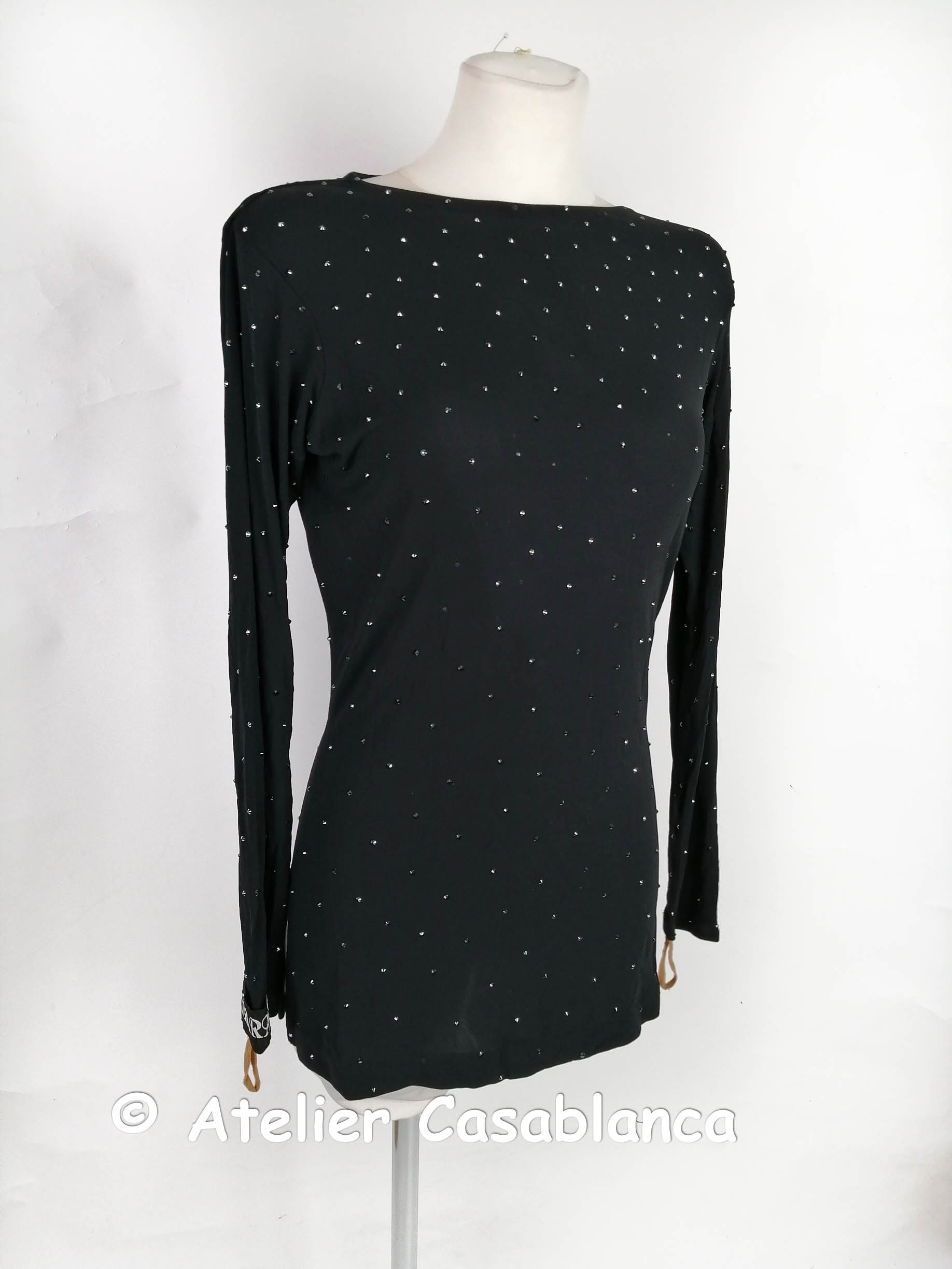 ポーランドのトップ選手、カロル・スレズ選手のためにポーランドのラグジュアリーダンスドレスブランド、マラボが制作したオーバーブラウスタイプのラテンシャツです。袖口にベージュのバングルがついているので踊っていて袖が上に上がってこないデザイン。オーバーブラウスタイプで両サイドにスリットが入っており、シャツ全体に黒のスワロフスキの石が貼られています。シンプルですがラインの美しい大変便利に使えるウェアです。サイズはSMサイズ、丁寧な縫製で大変美しいウェアです。25000円です。ウェブサイトに引っ越しておりますが、掲載内容はウェブとブログとまったく同じです。こちらのブログには引き続き新着情報を掲載していきます!インスタグラムはこちら: Ateliercasablancagermany どのサイトからお申込みいただいても大丈夫です。メールでのご連絡でも大丈夫です。下記のロゴをクリックしてください。こちらからもご試着お申込みいただけます:申し込みフォームからうまく送信できない場合には、casablanca.germany@gmail.comにご連絡ください。LINEはこちらです。ご質問がございましたらご連絡ください。Wifiがあるところでしか確認できないので、タイムラグが生じることがあります。
