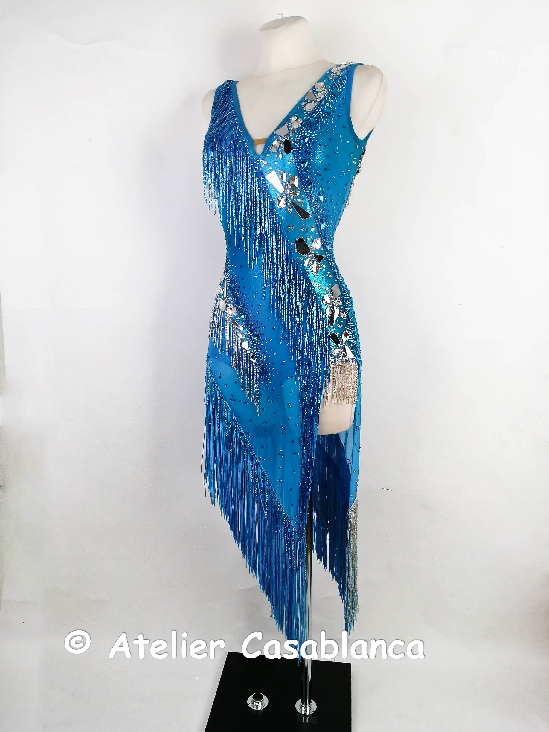 リトアニアの超素晴らしいダンスドレスブランド、エアドレスがリトアニアのシニア選手のために制作した、竹ビーズフリンジと石がびっしりで斜めのラインが大変美しい、とてもよく踊って大変スタイル良く見えるターコイズブルーのラテンドレスです。デコルテラインはVカットで背中が開いており、肩はあまり露出しない上品でシャープなライン。斜めのラインを強調するアシンメトリーなデザインで、ターコイズブルーとシルバーの竹ビーズフリンジおよびシルバーのルーレックスフリンジとブルーの普通のフリンジが大変良く踊るデザイン。フリンジを斜めに配置することで大変スタイル良く見えるデザインです。左サイドが短くなっておりスカートはアシンメトリーなラインなので、スカートが重く見えず足もとても長く見える全種目向きのデザインです。ミラーとブカプリブルーAB、インディコライトABなどのオーロラが入った強く輝くブルー系の石、およびクリスタルのプレチオサの石の装飾が大変豪華で美しく、非常に強く輝くドレスです。ボディにはオーロラの光沢が美しいフォイルプリントのストレッチライクラ素材も使用しており、ドレス全体が美しく輝くドレスです。大きな石とミラーを組み合わせることでドレスの輝きがより立体的で印象的になっています。石びっしりの細いバングルがたくさんと二の腕用の大きな石やミラーを装飾したバングルが付属しています。サイズはストレッチ素材の9号で、スカート派ウェストから最も短い部分(スリット部を除く)は52センチ、長い部分は82センチとなっています。フリンジは長い場合には切り落としが可能です。非常に丁寧で美しい縫製で、型紙のラインの美しさも素晴らしく、高品質な布、フリンジとプレチオサの輝きの強い高級な石をつかって制作された、最高級クラスの品質の素晴らしいドレスです。きれいにクリーニングされており、石落ちもほぼなくとてもとてもよい状態です。13万6000円です。ウェブサイトに引っ越しておりますが、掲載内容はウェブとブログとまったく同じです。こちらのブログには引き続き新着情報を掲載していきます!インスタグラムはこちら: Ateliercasablancagermany どのサイトからお申込みいただいても大丈夫です。メールでのご連絡でも大丈夫です。下記のロゴをクリックしてください。こちらからもご試着お申込みいただけます:申し込みフォームからうまく送信できない場合には、casablanca.germany@gmail.comにご連絡ください。LINEはこちらです。ご質問がございましたらご連絡ください。Wifiがあるところでしか確認できないので、タイムラグが生じることがあります。