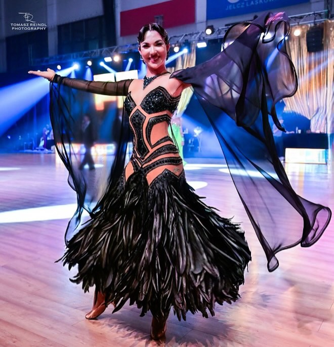 こちらのドレスはお譲りする方が決まりました。ありがとうございました。ブラックプールセミファイナリスト、ロンドンインターセミファイナリスト、欧州選手権ファイナリストのタイトルを持つウクライナ3位のトップ選手、マリア・スカッチ選手が2025年1月のUK戦で着用した、スカートの動きが超美しくオーストリッチの羽のフロートが非常に豪華な上品で華やかな黒&ベージュのスタンダードドレスです。2024年12月から2025年1月にかけてリトアニアのラグジュアリーダンスドレスブランド、DLKで制作され、UK戦セミファイナル入賞。先週末のマジェスティックにて決勝入賞。2試合だけ着用されたほぼ新品です。黒にベージュを組み合わせた、黒ながら暗くならない、明るさがあるデザインのドレスで、ボディ全体に様々な形のミラーを使っているので、ドレスの輝き方が非常に強く、ほかのドレスと全く違った輝き方をして大変目立ちます。デコルテのカットや縦のラインの入り方が非常にスタイリッシュで、肩や二の腕などはベージュメッシュで覆われているので、タンニングをされない方、露出の高いドレスが苦手な方にお勧めのデザインです。首元の石のブローチ風の石のオーナメントがDLKらしさを出してお、長そでで袖は指付きのグローブになっているので腕がとても長く見えます。ボリュームたっぷりでかつ長すぎない羽のフロートが非常に印象的です。ストレッチライクラの短いグローブに羽をつけているので、フィット感も抜群です。スカート派裾の広がりが通常のドレスとは大きく異なり、非常にダイナミックで大きく踊る超素晴らしい型紙で作られており、そのすごさは写真からもご覧いただけると思います。ベージュのジョーゼットを2枚重ねた上に黒のジョーゼットのスカートを組み合わせており、黒が暗くなりすぎず、非常に珍しい色合いになるのでフロアでとにかく目立ちます。黒のピアスが付属していますが、割と簡単にイヤリングに改造が可能なデザインになっています。サイズはストレッチ素材の7号又は9号で、ストレッチ性抜群で、超足長でスタイル良く見える、スタイリッシュで大変カッコイイおすすめのドレスです。スカート丈はウェストから約89センチあるので、身長160以上の方に対応します。マリア選手のドレスとしては通常より少し長めとなっており、スタイリッシュかつエレガントな印象を目指したとのことです。ドレスのデザインの監修はメインコーチャーのアレッシア・ベッティです。マリア選手は基本的にドレスは長く着用せず、基本1試合、最大でも2試合で手放します。こちらも2試合しか着用しておらず、それでもしっかりとクリーニングをしており、ほぼ新品の完璧な状態です。