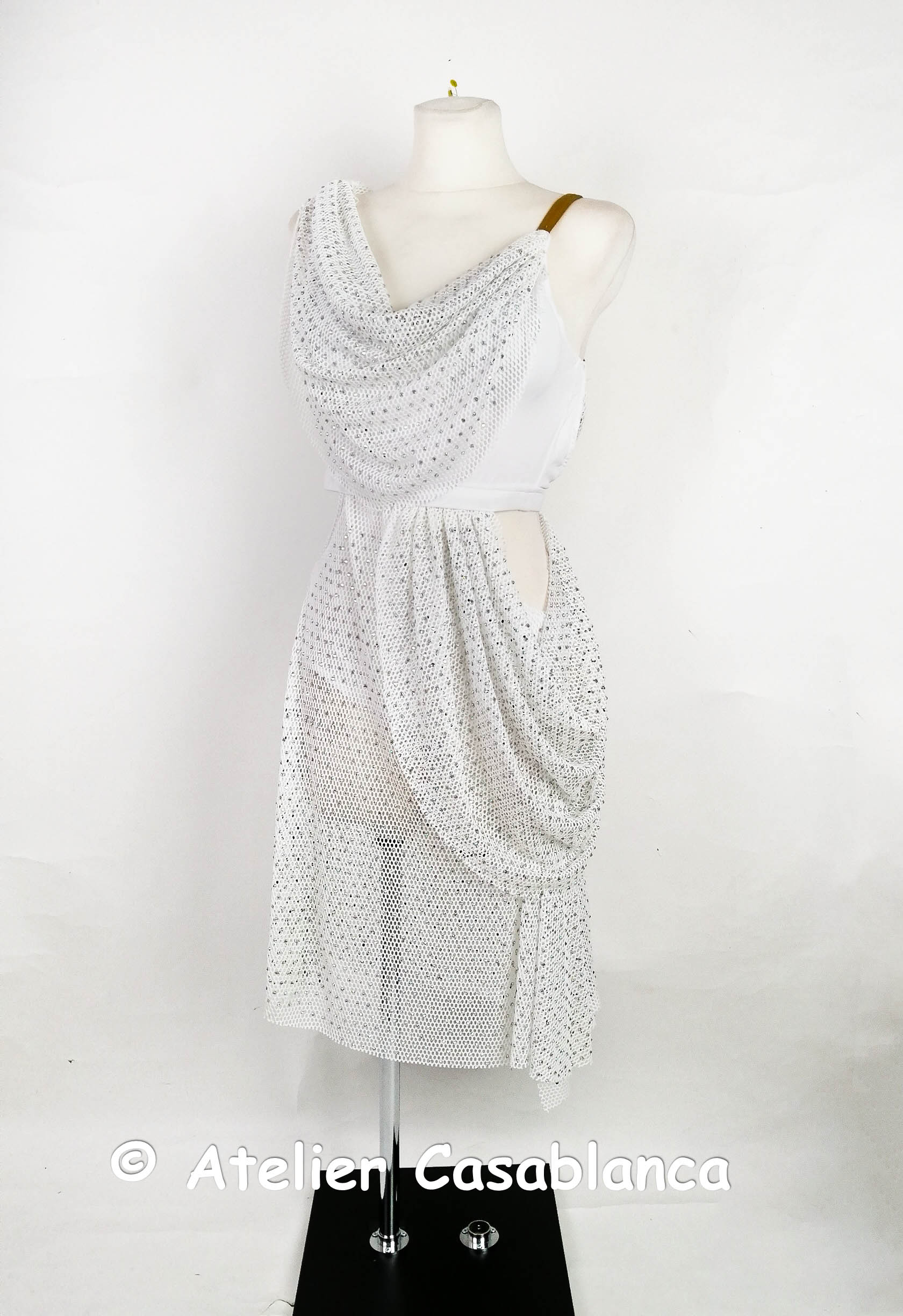 こちらのドレスはお譲りする方が決まりました。ありがとうございました。ウクライナの超素晴らしいラグジュアリーダンスドレスブランドで、アトリエカサブランカでも常に大人気の「カタリーナ」制作のエレガントで美しく大変良く踊る白のワンショルダーのラテンドレスです。ウクライナの選手のために制作されました。ワンショルダーでベージュメッシュと白のストレッチライクラ素材を組み合わせて制作されており、背中がベージュメッシュで覆われているので露出の少ないエレガントな印象のドレス。タンニングをされない方でもご着用OKのデザインです!斜めのラインが大変美しく、ベージュメッシュ部分にはパールとオーロラのプレチオサの石がびっしりと貼られており、ベージュと白の境界の部分には大きな縫い付けるタイプの石を美しく装飾しています。ドレス全体にパールが貼られており、非常に珍しいパールフリンジが大変良く踊ります。スカートは右が短く左が長いデザインですが左にスリットがあってスカートがフリンジと一緒に大変良く踊ります。裾にはパールフリンジの先端にシルバーのスパンコールが使われたデザインになっており、裾にアクセントがあって大変美しく印象的です。オーロラの石びっしりのバングルが4本付属しています。ドレスはカタリーナの手元でクリーニングと石、パールのメンテナンスが行われており、直用回数も少ないので大変良い状態です。サイズは9号または11号(選手は11号に近い大き目9号です)。スカート丈は長い部分65-70センチぐらいとなり、立ち姿だと膝はほぼ隠れ、踊っていると膝が見え隠れするデザインです。最高に丁寧な縫製で、白ですが非常にスタイル良く見えるルンバスタイル。背中も出ないので安心してご着用いただけるデザインです。左腕用のベージュメッシュのグローブをご希望の場合にはお申しつけください。カタリーナが制作してつけてくれるとのことです。なかなか出てこない、露出が少なく、かつ色が明るくて大変良く踊るドレスで、しかもカタリーナの制作なのでとてもとてもおすすめです!縫製の美しさ、ラインの見え方の素晴らしさ、装飾の完璧さ、素材の品質、ブランド力などすべてにおいて最高に素晴らしいドレスです。>