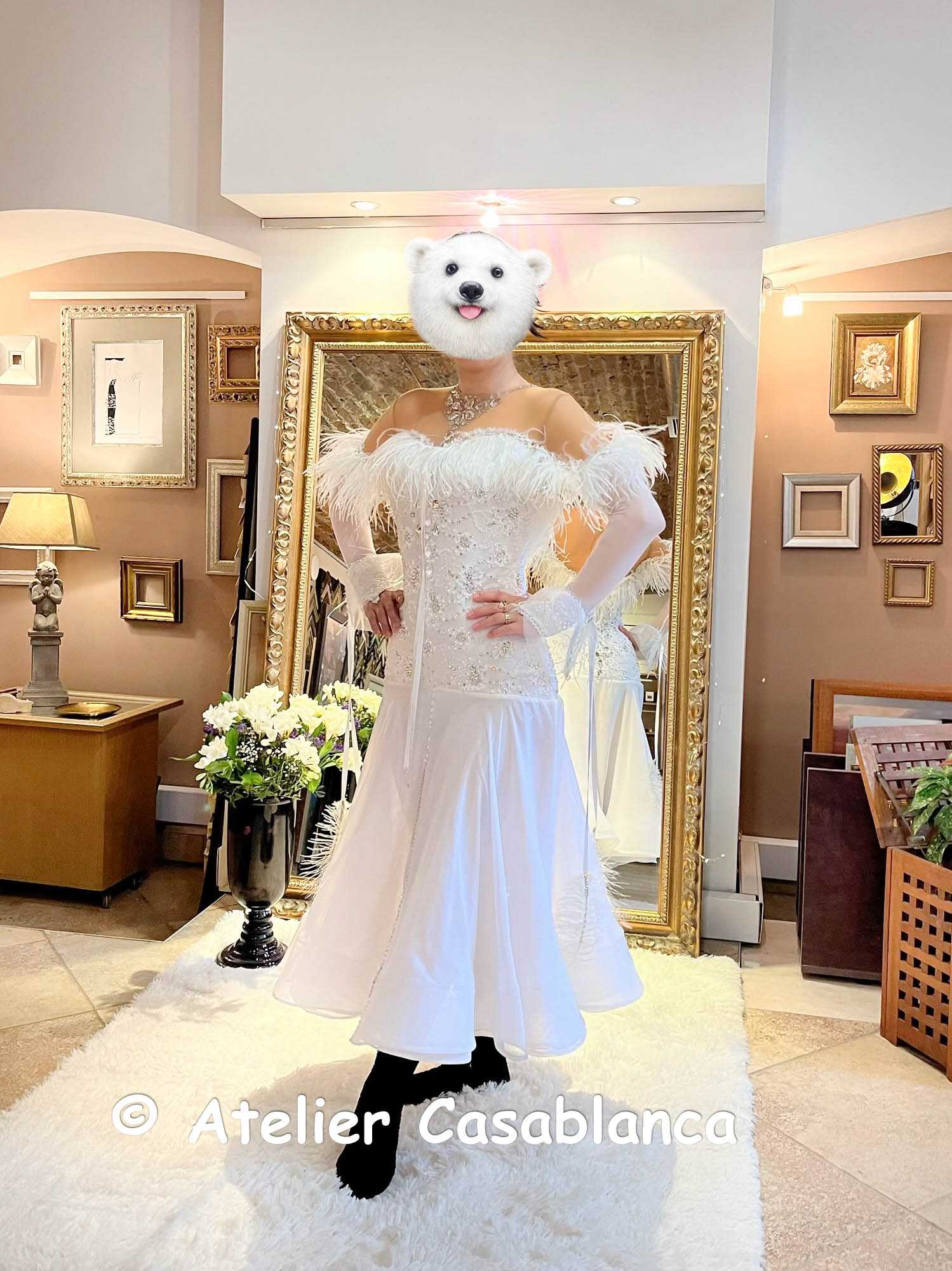 ラトビアの超素晴らしいダンスドレスブランド、「ガリーナ・ペトルナ」制作の、トップスのオーストリッチの羽のデザインが超スタイリッシュで美しい白の長袖のスタンダードドレスです。ボディ部分にはストレッチレースを使っており、ジョーゼットのスカートを3枚重ねており、裾にはすべてホースヘアが縫い込まれています。ボディのストレッチレース部分とデコルテには、クリスタルのスワロフスキの石が大変豪華に美しく装飾されており、ホースヘアの広がる袖のデザインやパールの装飾などが大変美しく、とてもエレガントで美しいデザイン。肩や背中はベージュメッシュでカバーされているので、タンニングをされない方、あまり肌を露出したくない方にお勧めのデザインです。デコルテから肩にかけてのオーストリッチの羽のデザインが非常に美しく、一見シンプルですがとても軽くて大変きれいに踊り、かつ上品でスタイリッシュ、なかなか見かけない大変美しいデザインのドレスです。サイズはストレッチ素材の9号ですが、ストレッチが強く11号にも対応します。スカート丈はウェストから約80センチと小柄な方向けなので、管理人が試着している写真では変な黒の靴下がまるまる見えてしまってかなりダサくなっています。(寒かったので申し訳ありません)丁寧な縫製でラインもとても美しく、英国製の素材を使って制作された大変美しいドレスです。日本へいったん売却された再リサイクルドレスで、日本ではデモで3度しか着用されていないのでとてもきれいで良い状態です。11万9千円です。ウェブサイトに引っ越しておりますが、掲載内容はウェブとブログとまったく同じです。こちらのブログには引き続き新着情報を掲載していきます!インスタグラムはこちら: Ateliercasablancagermany どのサイトからお申込みいただいても大丈夫です。メールでのご連絡でも大丈夫です。下記のロゴをクリックしてください。こちらからもご試着お申込みいただけます:申し込みフォームからうまく送信できない場合には、casablanca.germany@gmail.comにご連絡ください。インスタグラムからのダイレクトメッセージですとすぐに返信が可能です。